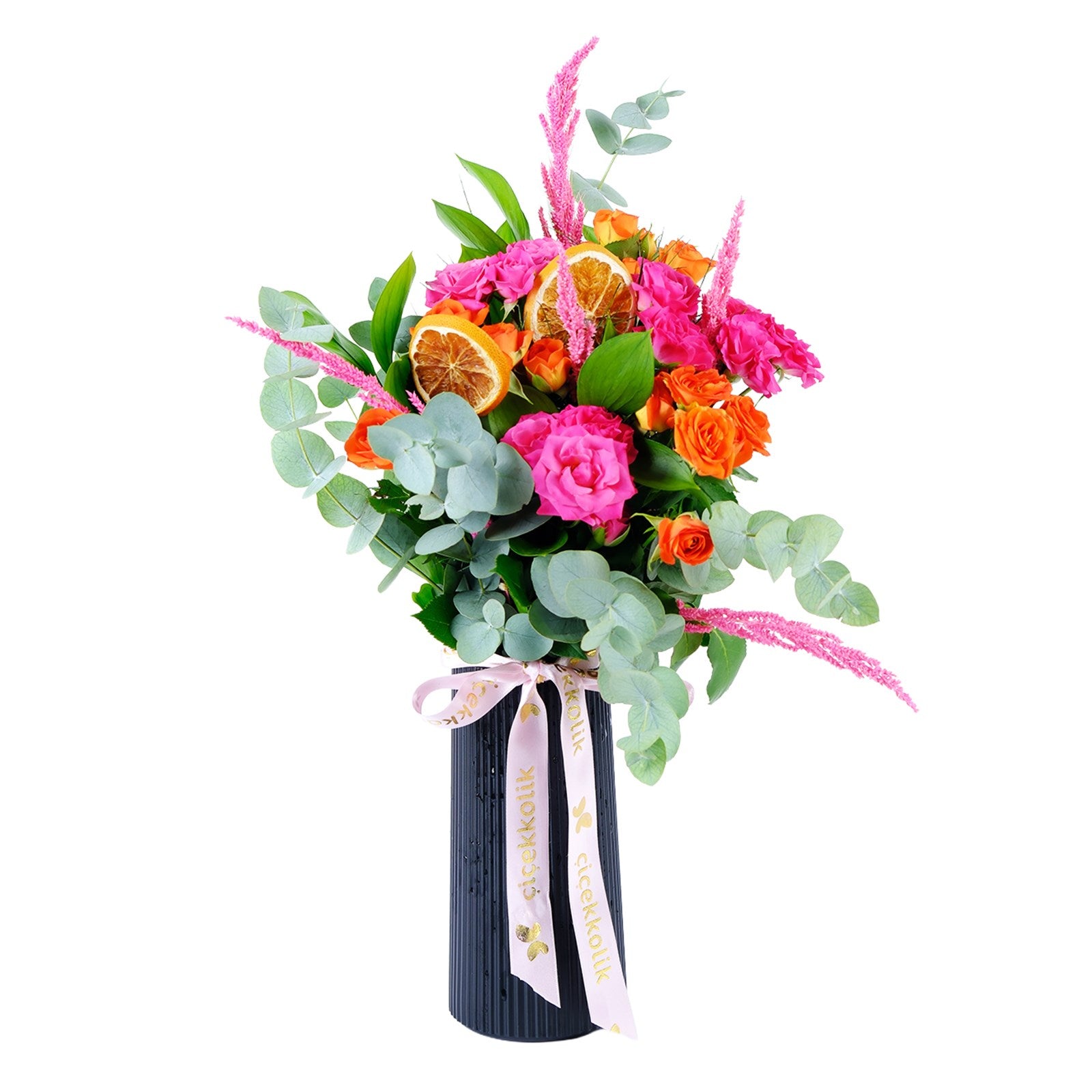 Enerjisi yüksek renklerin buluştuğu Colorful Story Güller, modern ve ferah bir görünüm sunar. Turuncu güller, pembe güller ve okaliptus dalları zarif bir kompozisyon oluşturur.