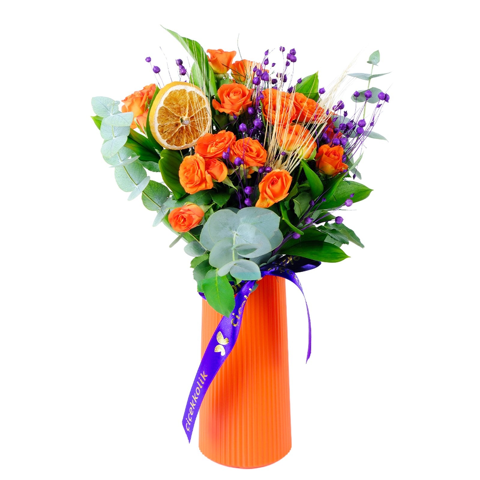 Enerjisi yüksek renklerin buluştuğu Peacyh dream turuncu gül, modern ve ferah bir görünüm sunar. Turuncu güller, okaliptus dalları ve kuru çiçek dalları zarif bir kompozisyon oluşturur.