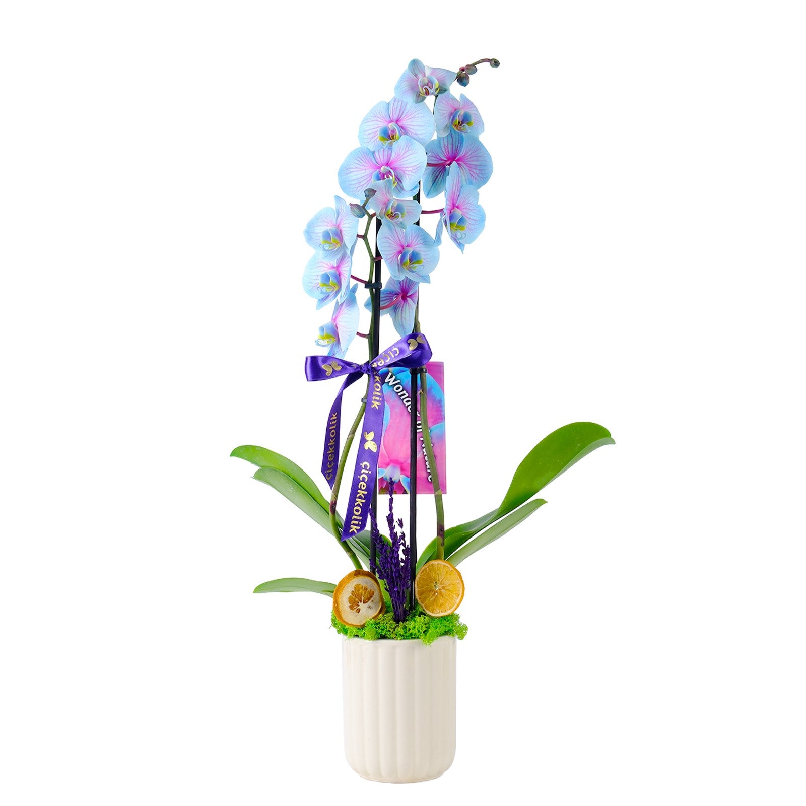 Zarif görünümü ve eşsiz rengiyle Çift Dallı Mavi Orkide, yaşam alanlarına modern bir dokunuş kazandırır. Beyaz Seramik Saksısı ve Mor kurdele detayıyla hem sofistike hem de dikkat çekici bir tasarım sunar.